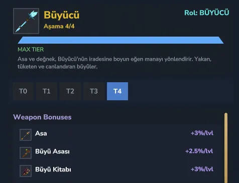 - T4 Büyücü Gücü: Yeni sistem hesaplamalarıyla birlikte, T4 (Tier 4) Büyücü sınıfına sahip bir oyuncu seviye atladıkça her seviye başına yaklaşık +%2.5 ile %3 arası devasa bir hasar artışı (scaling) kazanıyor.